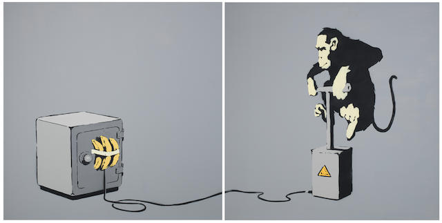Monkey Detonator, one of Banksy’s most famed and coveted images, perfectly exemplifies the Bristol-born artist’s irreverent wit in its portrayal of a cheerful monkey jumping directly onto a detonator to ignite an explosion. Caught mid-leap with hands already grasped around the plunger, ready to push down, a curious juxtaposition is presented between the dangerousness of the device and the chimp’s determination, despite the obvious risk of being fatally harmed himself. As a captivating example from Banksy’s visually striking oeuvre, Monkey Detonator invites viewers to both laugh at the absurdity of the composition whilst also reflect on the distinct socio-political undercurrents quintessential of the artist’s oeuvre.
