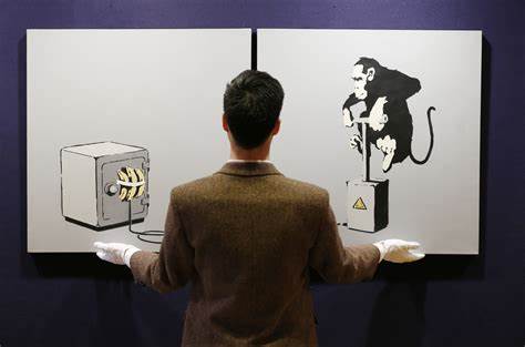 The monkey is a recurring motif in Banksy’s oeuvre, used by the artist as a deliberately provocative character since the early 2000s. In a contemporary take on “Singerie”, a visual arts genre popular among French artists in the early 18th century which depicted comical scenes of monkeys aping human behavior, Banksy’s chimps too, are often presented in ironic juxtapositions that provide a tongue-in-cheek satirizing of society which so often thinks of itself as ‘above’ the animal kingdom.