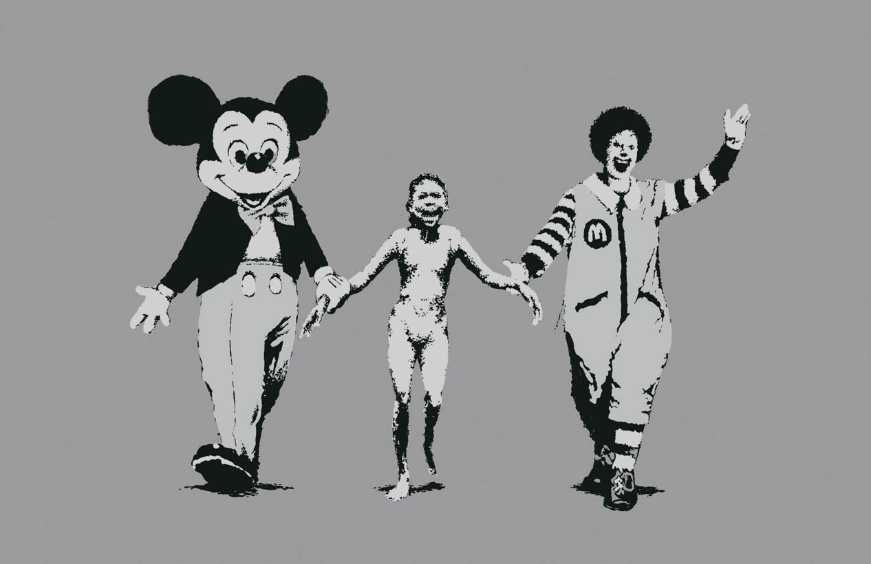 Banksy reinvents the Pulitzer Prize-winning image of this 9-year-old girl, fleeing a napalm blast naked in fear. By wittingly adding alongside two icons of American consumer culture, Mickey Mouse and Ronald McDonald, the artist creates a sickening juxtaposition with the image of Kim screaming in pain from the napalm burns.