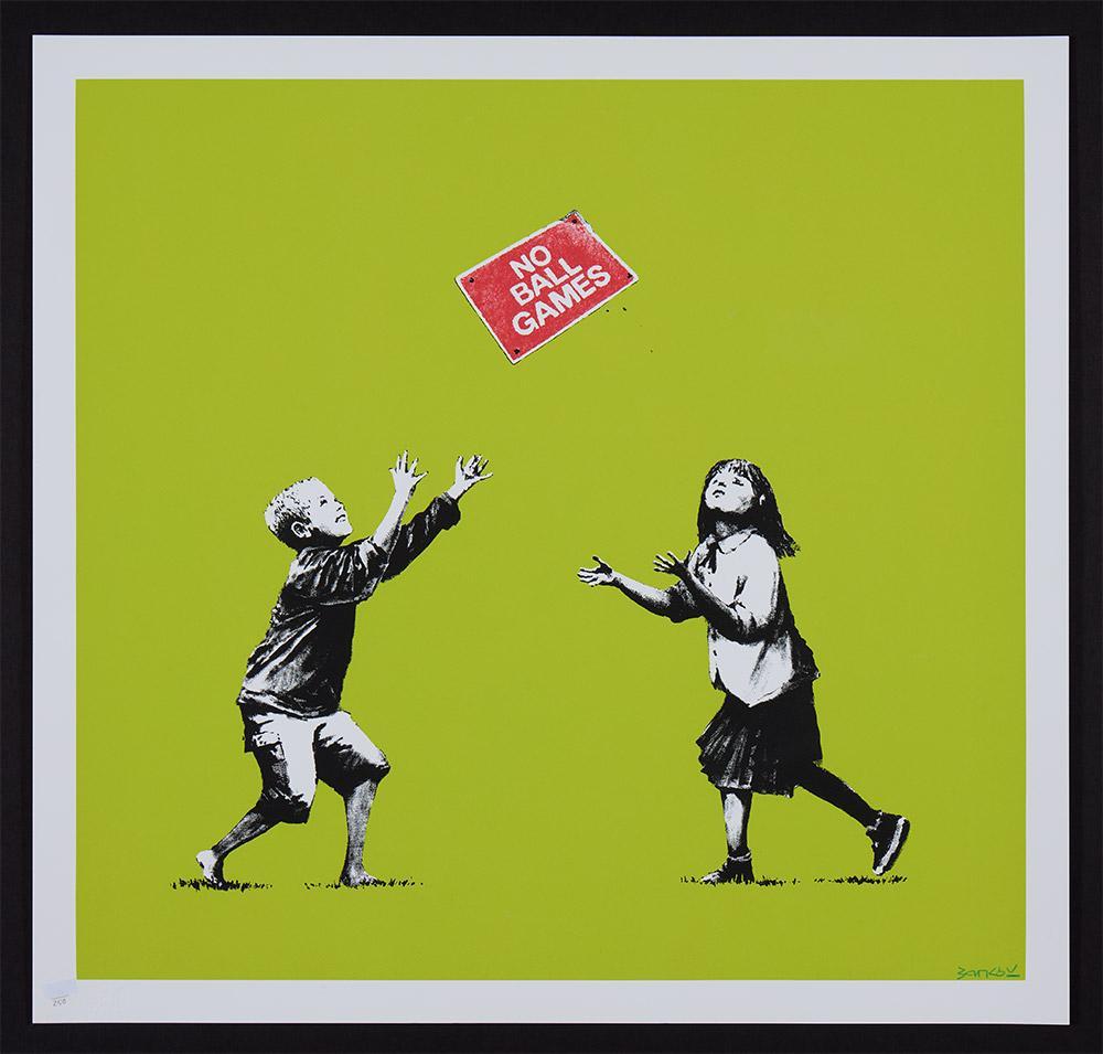 No Ball Games portrays two children playing outside with what appear to be a sign that reads, “NO BALL GAMES” as if it were a ball itself. The image, portrayed in Banksy’s iconic stencil-style, is obviously rich with irony. The artist is making a social comment on how even basic children’s activities seem to be now controlled and regulated, thus maybe even encouraging children (and adults) to break rules.