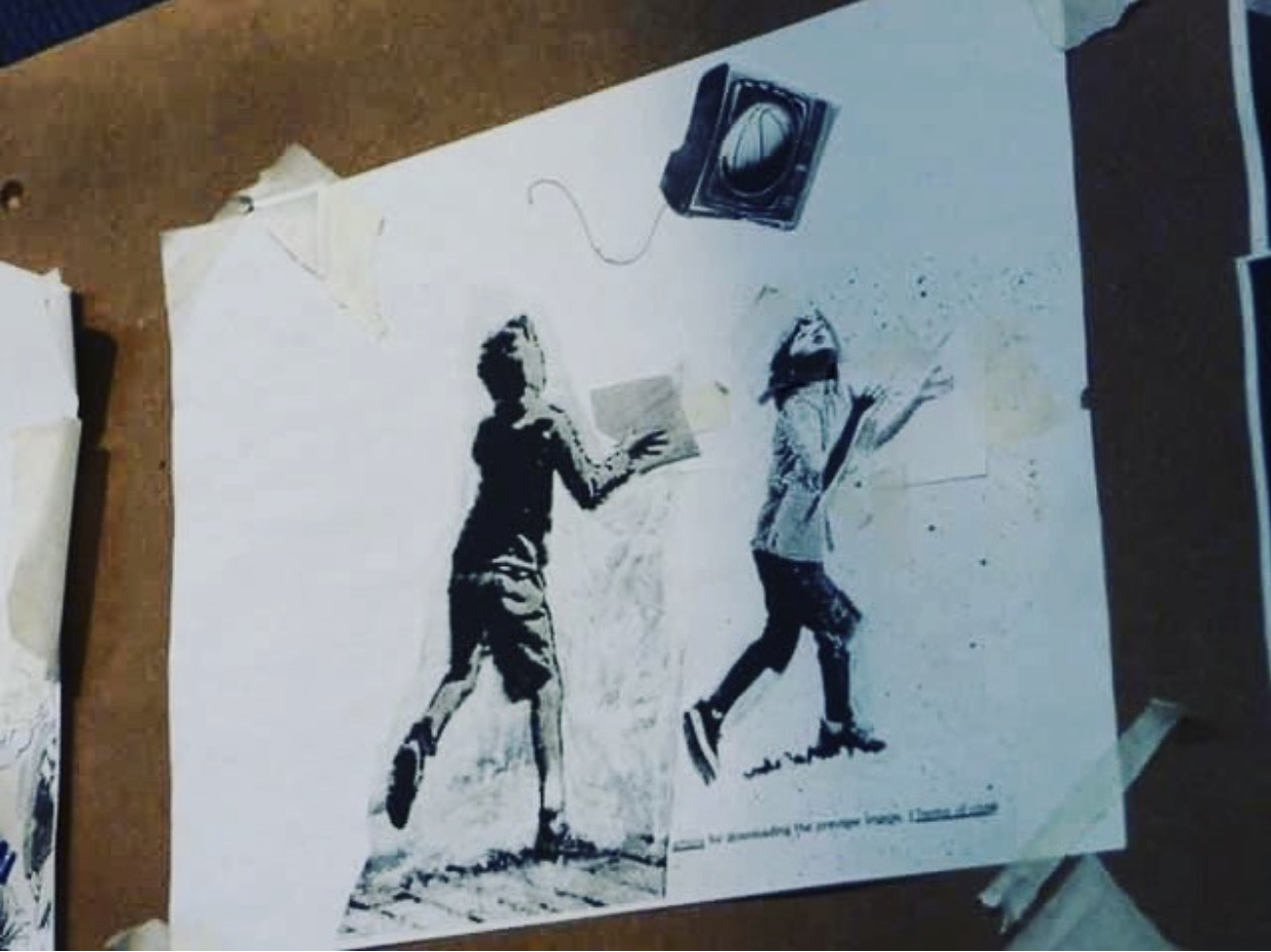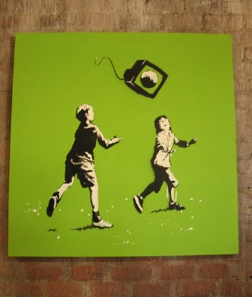 No Ball Games first appeared on canvas in 2006 at Barely Legal which took place in the area known as Skid Row in downtown Los Angeles. However, in this first version, kids are playing with a TV displaying an image of a ball.