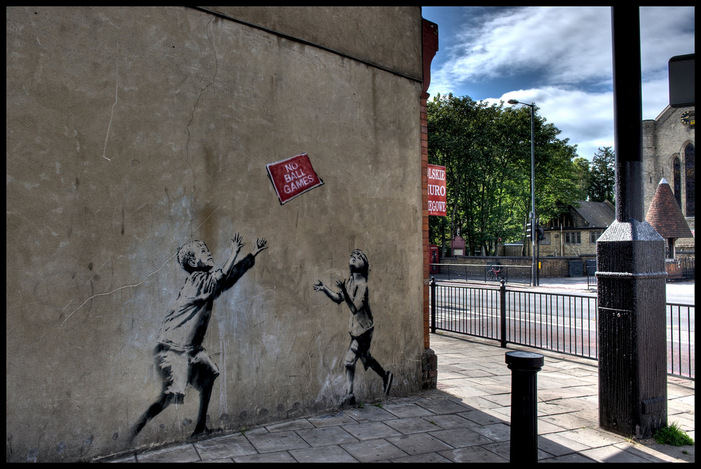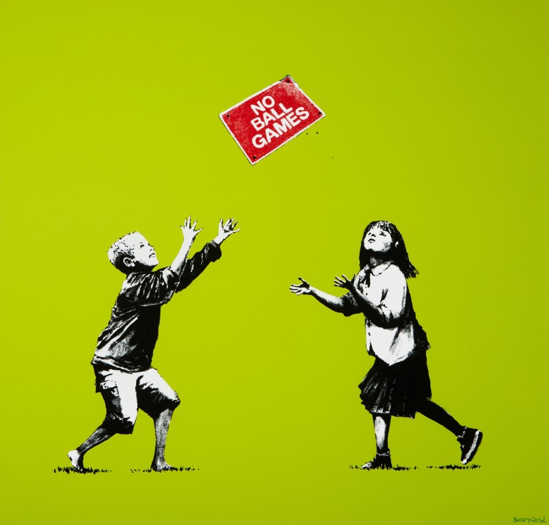 No Ball Games portrays two children playing outside with what appear to be a sign that reads, “NO BALL GAMES” as if it were a ball itself. The image, portrayed in Banksy’s iconic stencil-style, is obviously rich with irony. This monochromatic print (except for the red of the sign) is making a social comment on how even basic children’s activities seem to be now controlled and regulated, thus maybe even encouraging children (and adults) to break rules.