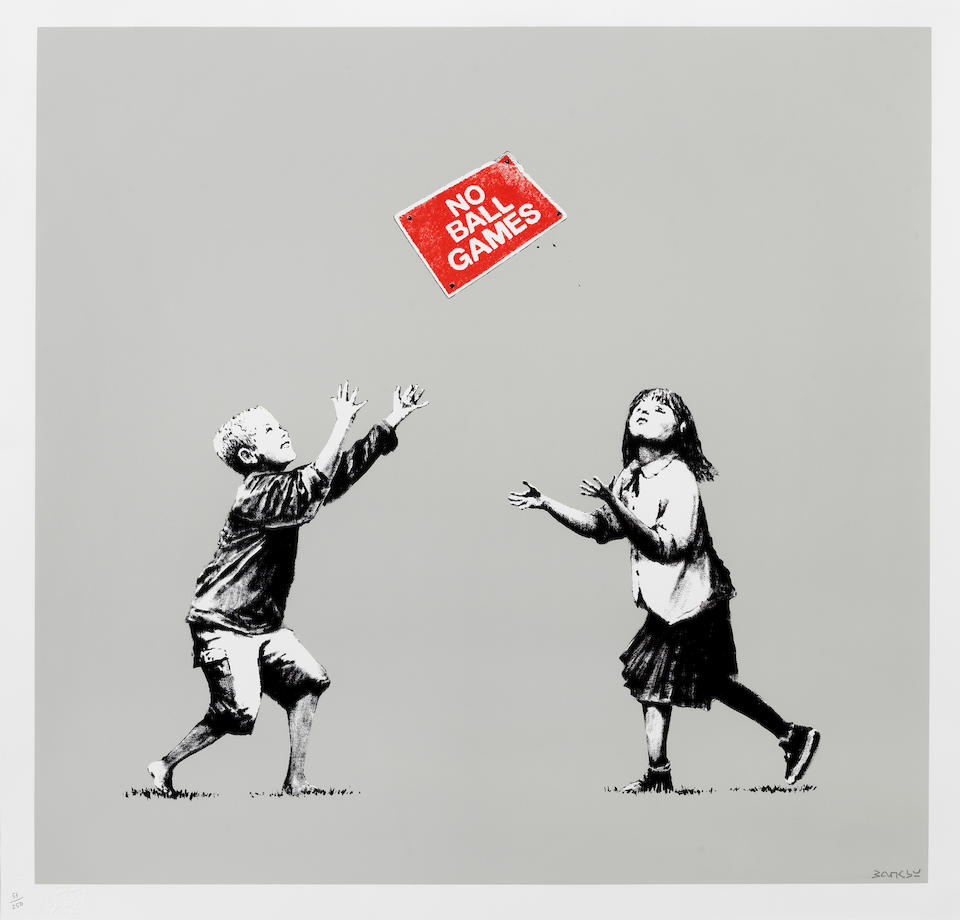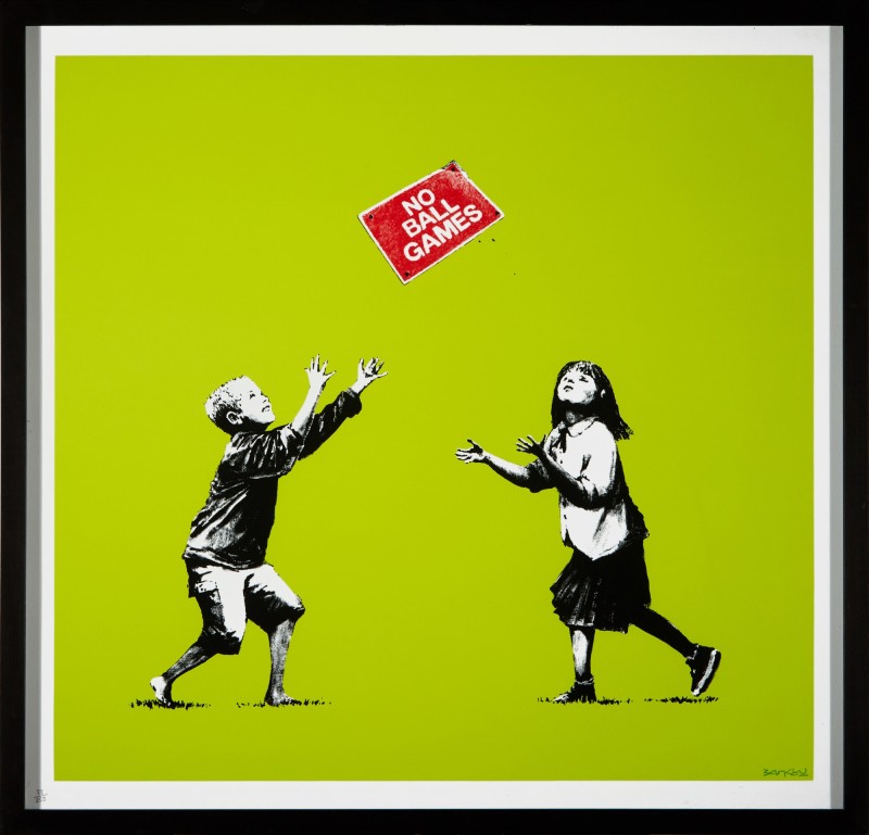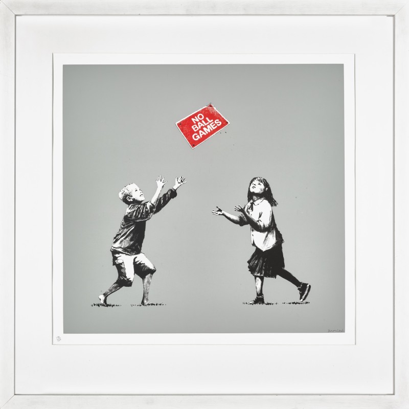 2009 was a turning point for Banksy as he parted ways from long-term gallery Steve Lazarides, and announced a new entity called Pest Control Office would be the unique point of sale for Banksy artworks going forward. No Ball Games (Grey) was sold by Pictures on Walls, at their Commercial Street Gallery in London. No Ball Games (Green)was only sold via online lottery.