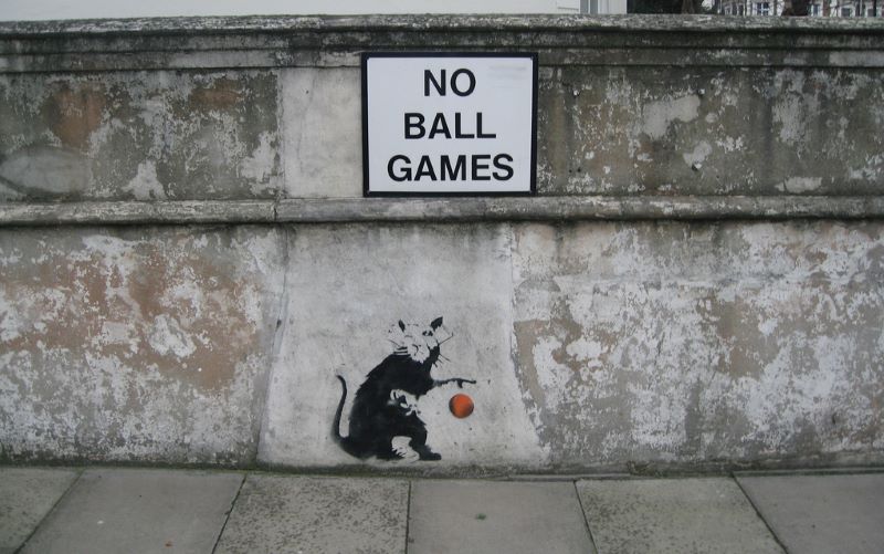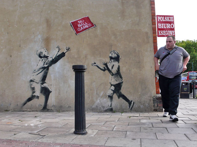 The irony of No Ball Games critiques the rules that Banksy believes restrict society on a daily basis. Banksy mocks overprotective governments, or “nanny states,” interfering with personal choice, implying that even innocent, everyday children’s activities like playing ball outside are controlled by the state.