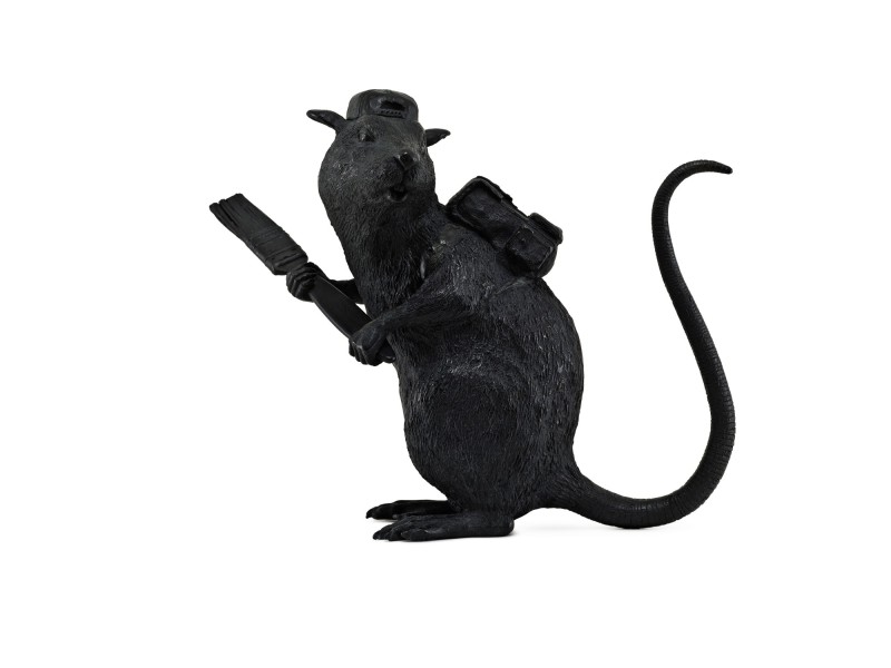 Bronze Rat is one of the rarest Banksy sculptures, as only 12 were produced. It portrays a rat carrying a back-pack, a reverse cap, and a giant paint-brush. Most probably depicting a graffiti artist who, in the dead of night while others are asleep, sneaks around town with the “tools of the trade” – backpack (presumably with paint, stencils, etc), and a paintbrush that will be used to create their art and communicate their message. Like rats, graffiti artists are nocturnal creatures that carry out their work in the streets, in a clandestine manner, and they are treated with disdain and disgust by society.