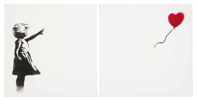 Banksy released his first edition (of 25) on canvas of Girl with Balloon in 2003, and later revisited the imagery in 2005 when he produced Girl with Balloon as a diptych. This, too, was an edition of 25. The famous Girl with Balloon also appears in another of his canvas editions from 2003, Kids On Guns.