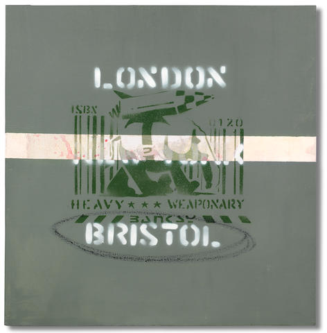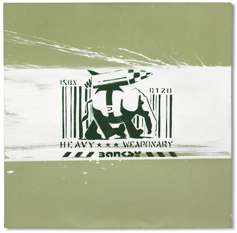 Heavy Weaponry is perhaps the most quintessential Banksy canvas in the sense that it features a number of motifs the artist has been using since the very beginning of his career. Banksy created at least 4 editions on canvas using the Heavy Weaponry stencil: 2 editions of 10 in 2000, 1 edition of 25 in 2003, and a special, Silver Edition of 25 in 2004.