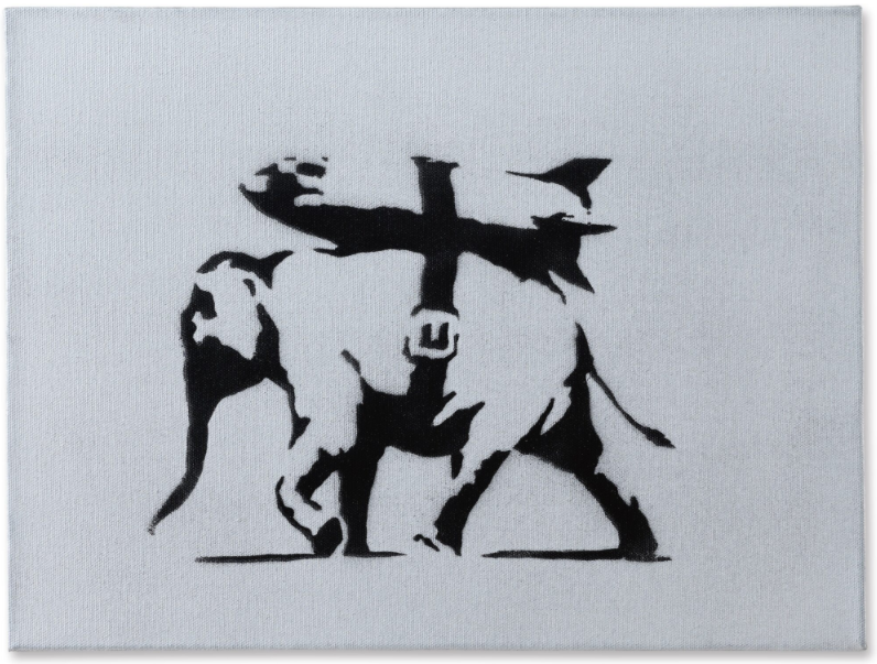 Heavy Weaponry depicts a singular elephant made in Banksy’s recognizable stencil style with a rocket strapped to its back. The image of the elephant bearing a rocket on its back carries various interpretations; presumably the general message is anti-military, in line with Banksy’s other works using similar imagery. The barcode in the background touches on the theme of consumerism, in this case, likely referring to the commodification of war and violence, as well as the role money plays in it. The names of the cities where the artist painted many of his murals at the time are also featured, all of them crossed out except for Bristol (where he hails from).