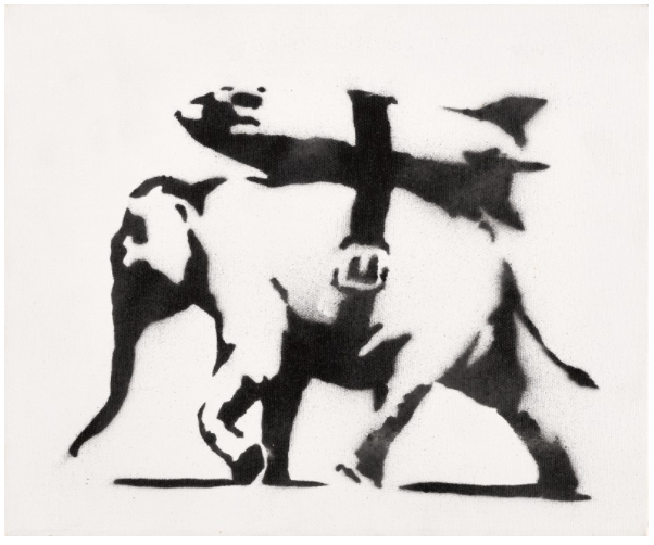This version of Heavy Weaponry is filled with a variety of symbols and motifs that have recurred throughout the Bristol-born artist’s practice: an oversize barcode, and his signature elephant backpacking a missile. As was the case with the first edition of Heavy Weaponry, the piece is charged with a not so thinly veiled “anti-war” sentiment, openly questioning and criticizing the commoditization of military engagement.