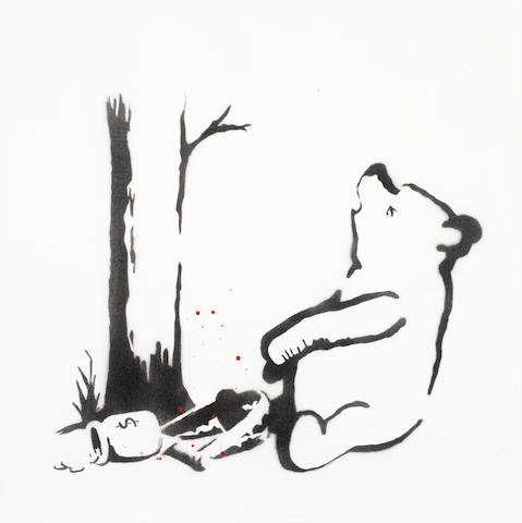In Winnie the Pooh, Banksy depicts the endearing cartoon bear under a tree, his foot caught in a bear trap. But, in a usual Banksy twist, instead of Pooh Bear’s famous honey pot , he has a pot of money.