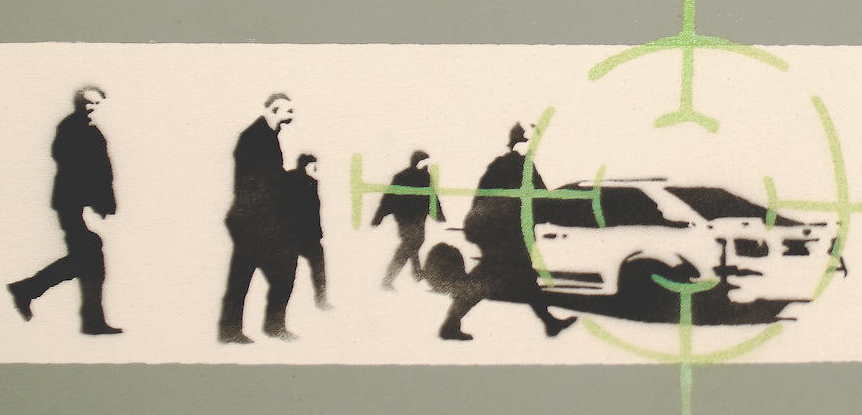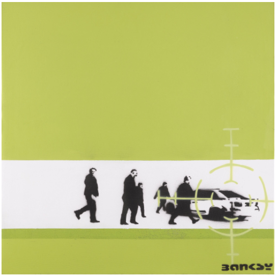 As a recurring theme in Banksy‘s oeuvre, this work makes reference to war and violence, as well as the constant sense of paranoia in which nobody can be trusted. If the men in suits are to be viewed as politicians or perhaps simply “men of power,” this work makes a pointed statement about the hypocrisy prevalent in elite circles of power and money. It might also be viewed as ironic that the very methods by which these men seek to eliminate threats would be used against them. Precision Bombing was exhibited for the first time at Severnshed, Banksy’s first exhibit in his hometown of Bristol.