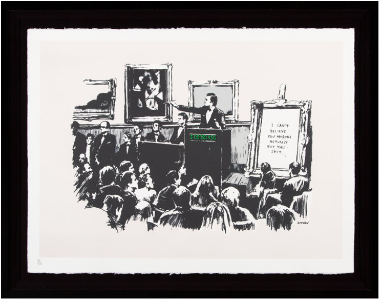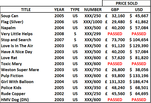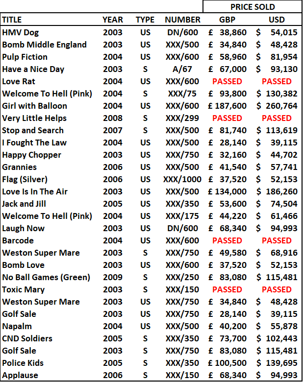 That does not necessarily reflect any major issue in the Banksy Prints market. Poor results at auctions often are the result of a conjunction of many potential different factors: (1) the quality of the prints offered (condition issues result in bought-ins or lower prices): (2) the content and organization of the auction (a very long auction and prints presented towards the end would not give good results); (3) the timing (in this case this auction was handled while Bonhams is running its first online auction for Banksy Prints); (4) more generally the lack of targeted marketing of the auction house itself (lack of preparedness); and/or (5) simply bad luck (no bidders are available at that time in the case of live auctions).