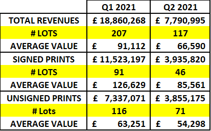 117 Banksy prints sold during Q2 of 2021 for a total value of GBP 7,790,995 / USD 10,887,684, which represents around half the revenues generated during Q1 2021, which has always been a strong Quarter for Banksy with both Sotheby’s and Christie’s online auctions.