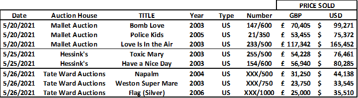 Tate Ward Auctions included no less than 17 Banksy Prints to its urban art auction on 24 June 2021.