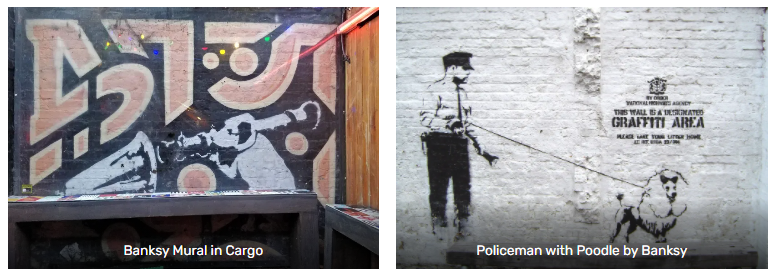 Cargo itself sits underneath the railway bridge. It was here underneath the archway that Banksy held his first exhibition in London. Look closely and you can even see the framed outline of some white boxes which once contained Banksy stencils from early in his career. Far more relevant nowadays are the pieces from SAM3, Bastardilla and Thierry Noir. Two actual Banksy pieces however do still exist just round the corner in the courtyard.
