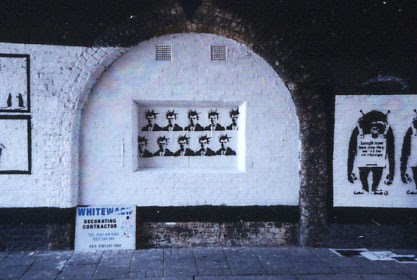 Painting a series of stencils from his back catalog, Banksy covered the walls on either side of what is today, the entrance to the nightclub Cargo. Banksy’s street canvas here was a former utility entry that had long since been blocked up.