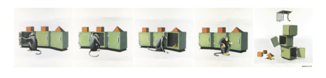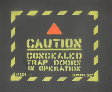 Many early Banksy originals were exhibited, mostly stencil and acrylic works on canvas. The collection of work on view included the notable Simple Intelligence Testing, a series of four canvases featuring a monkey, which sold eight years later on 28 February 2008 at Sotheby’s London for a record GBP 635,500.