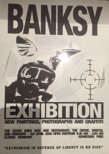 After moving to London in early 2000, Banksy returned to his hometown of Bristol in February of the same year, where he opened his first solo-exhibition under his own name at the restaurant Severnshed, now called the Harbor House, located in a boathouse at the Bristol docks.