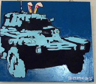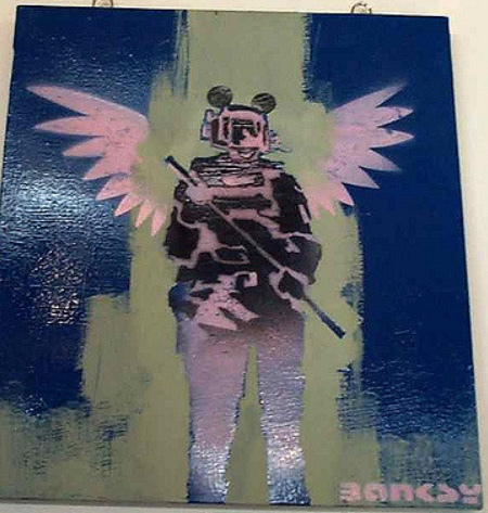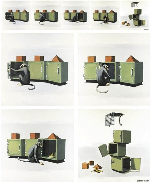 Many early Banksy originals were exhibited, mostly stencil and acrylic works on canvas. The collection of work on view included the notable Simple Intelligence Testing, a series of four canvases featuring a monkey, which sold eight years later on 28 February 2008 at Sotheby’s London for a record GBP 635,500.