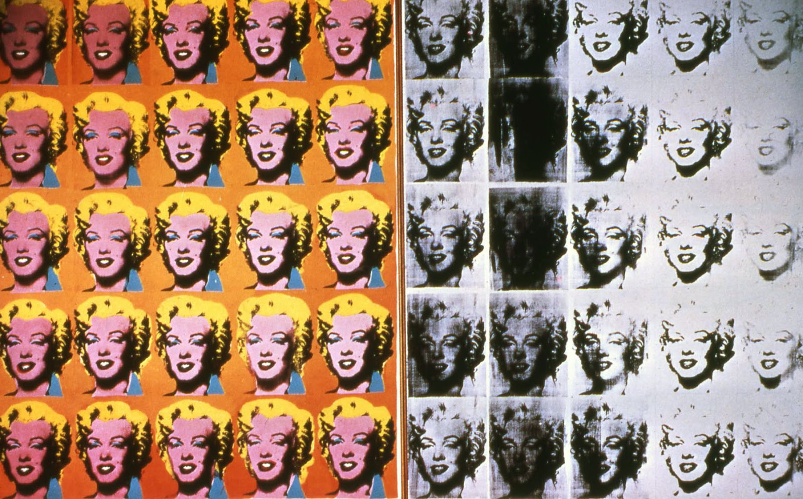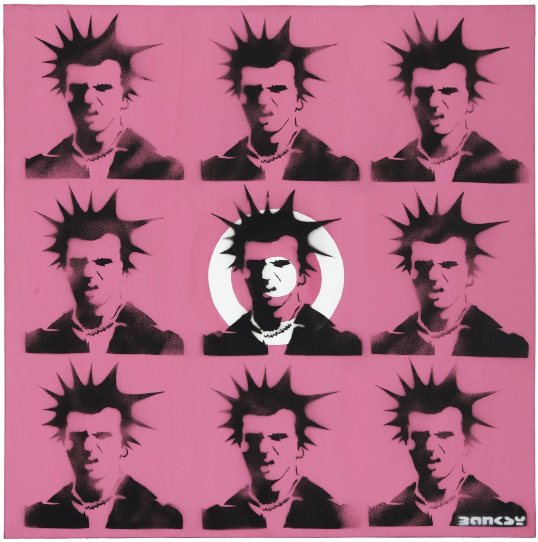 Working simply with paint and a stencil, Sid Vicious sees Banksy preserve his signature street art process, reenacting it on canvas in a style similar to Pop Art pioneer, Andy Warhol. Warhol’s famous screen-prints often illustrated the faces of well-known celebrities and political figures of grandeur. These paintings are aesthetically comparable with Banksy’s Sid Vicious, whereby the faces of icons, such as Marilyn Monroe, are reproduced in a formation of adjacent squares, amongst vibrant milieus and overlaid with detailing. In contrast to the idolization of these emblematic figures of contemporary culture, Banksy uses this visual to venerate Vicious and his punk ideologies.