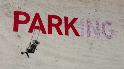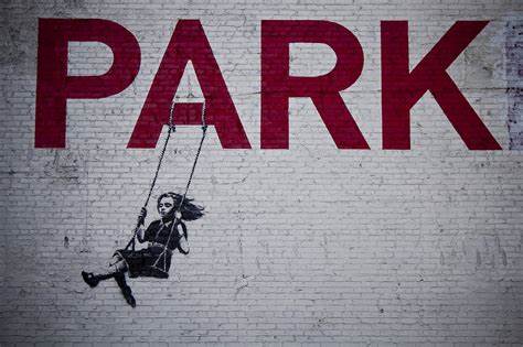 The ‘ING’ portion of the “PARKING” sign has been whitewashed out to emphasize the word “PARK”. Banksy then stenciled a young girl on a swing hanging to the letter A.