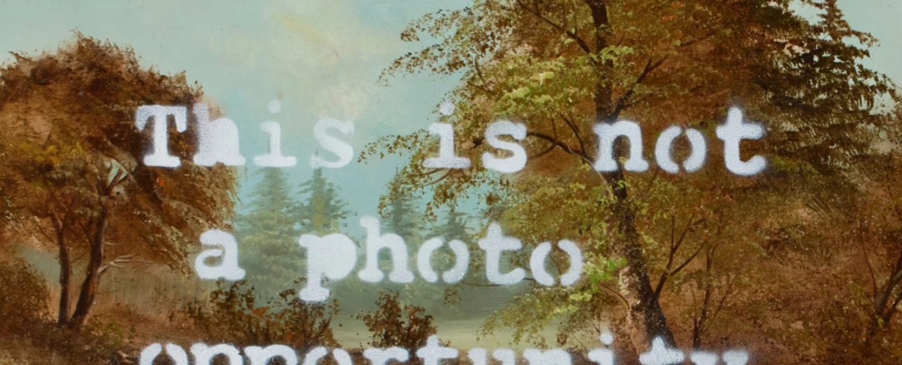 Galvanized by social, political and environmental consciousness and armed with satirical prowess, This is not a photo opportunity is a layered conflation of Banksy’s public performance and studio work. Borrowing from Dadaist traditions, it is through appropriation — here commanding verbiage placed overtop a ready-made painting — that This is not a photo opportunity critiques society’s predilection for photographing, rather than working to preserve, areas prone to rapid disappearance. The prescience of this painting is furthered by the rising use of social media, wherein aesthetics, rather than actions, are of utmost importance. Indeed, This is not a photo opportunity embodies Banksy’s singular ability to contemplate social issues through an unlikely union of humor and history.