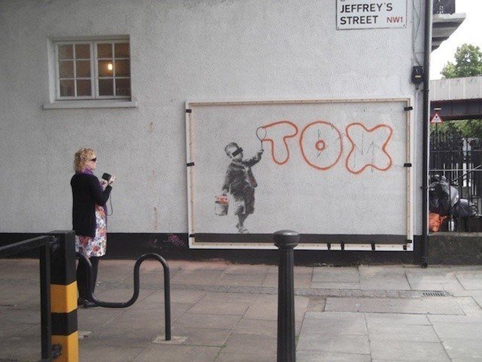 This Banksy stencil figure appeared on Jeffrey Street in Camden in June 2011, as an addition to graffiti artist Daniel Halpin’s, also known as Tox.  Tox was previously convicted for tagging multiple locations in London over a period of three years and was mocked as ‘no Banksy’ by the prosecution due to his lack of creative artistry with his graffiti works.