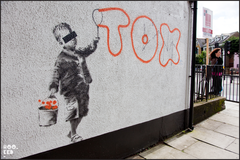 As a response, Banksy created an artwork of a little boy blowing the Tox tag as a bubble – whether as an act of solidarity or to make fun of the other artist is up to the public to decide. It’s undoubtedly one of his cheekier pieces that stays true to his graffiti artist roots and shows his enduring connection to the London scene.