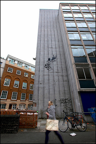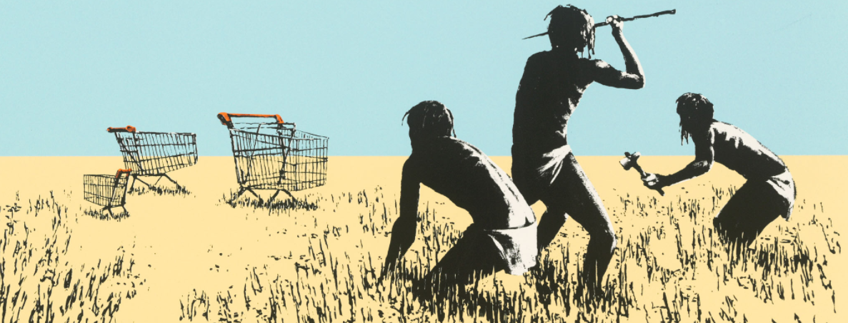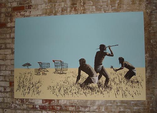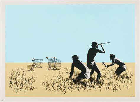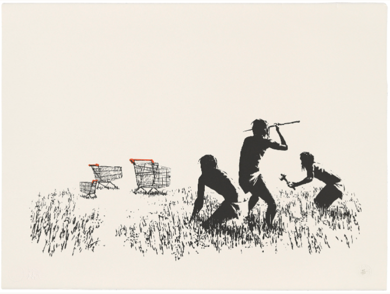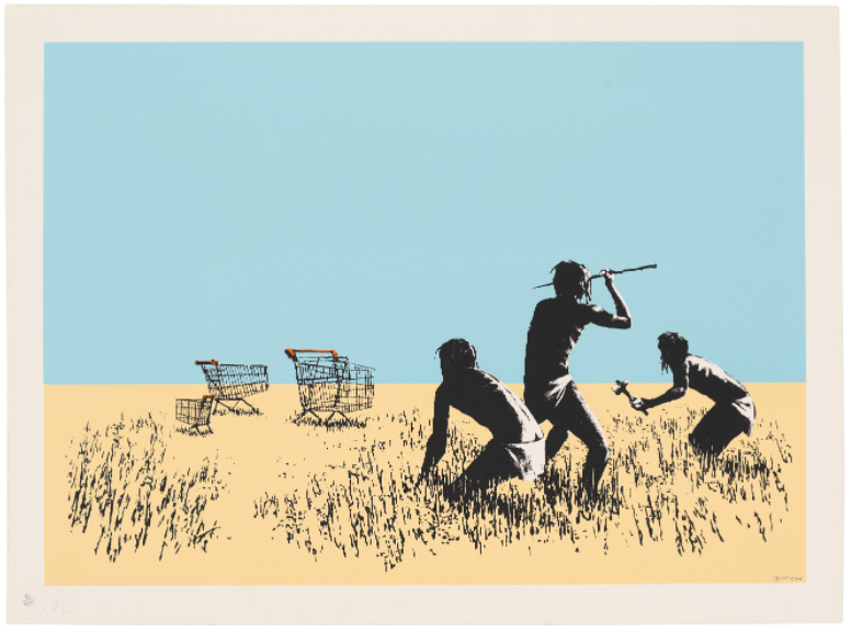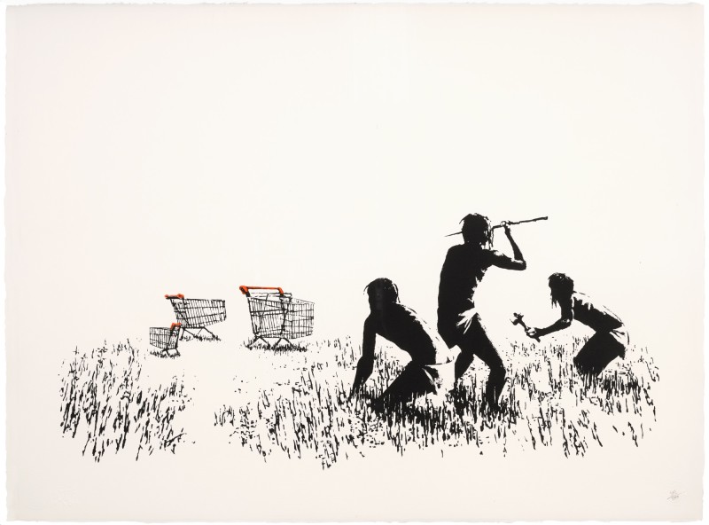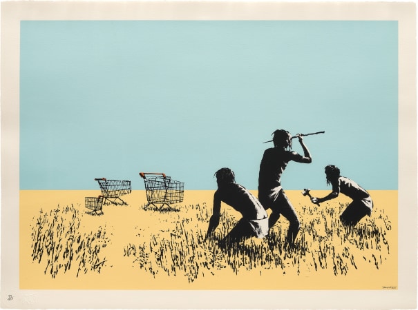 The trolley, comic in its incongruity, nods to our consumer society’s predilection for, and reliance on, highly processed, branded packaged food products, and our inability to fend for ourselves. Grouped like antelope in a field, the barren nature of the landscape in which we find these alien carts nods to our willingness to ship foods and other commodities all over the planet to be picked up whenever convenient by the consumer in the aisles of big chain supermarkets. With sardonic wit, Banksy juxtaposes his trolleys with a trio of Neanderthal hunter-gatherers, thereby shining a critical light on how far we as human beings have deviated from our base instincts, and abilities.