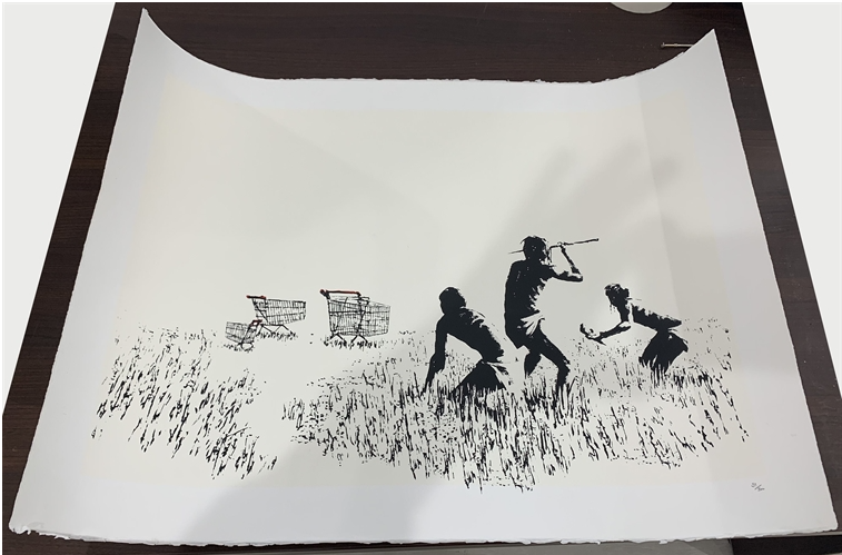 Trolley Hunters is the perfect incarnation of Banksy’s distinctive marriage of street art, graffiti and satire. Featuring three prehistoric men in a desert, the atmosphere of Trolley Hunters is both eerie and lighthearted. Holding various weapons, the three men pictured are poised to attack. The targets of their attack are, in typical Banksy fashion, trolleys – or shopping carts. The poignancy of the resulting work is twofold; firstly in its timeless critique of capitalism, and secondly in its unique and unexpected resonance today. With Trolleys, Banksy offers the viewer a provoking satire about the impact of consumerism on the ability of modern men to provide for themselves. Trolleys cleverly mocks contemporary society by suggesting that, isolated in cities, with no way of growing or catching our own food, we depend on the products offered by giant supermarkets to survive.
