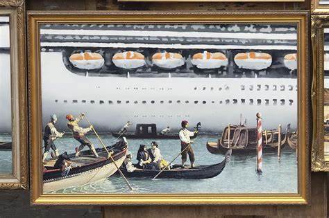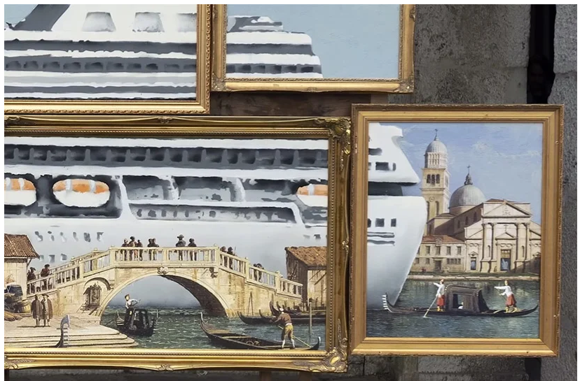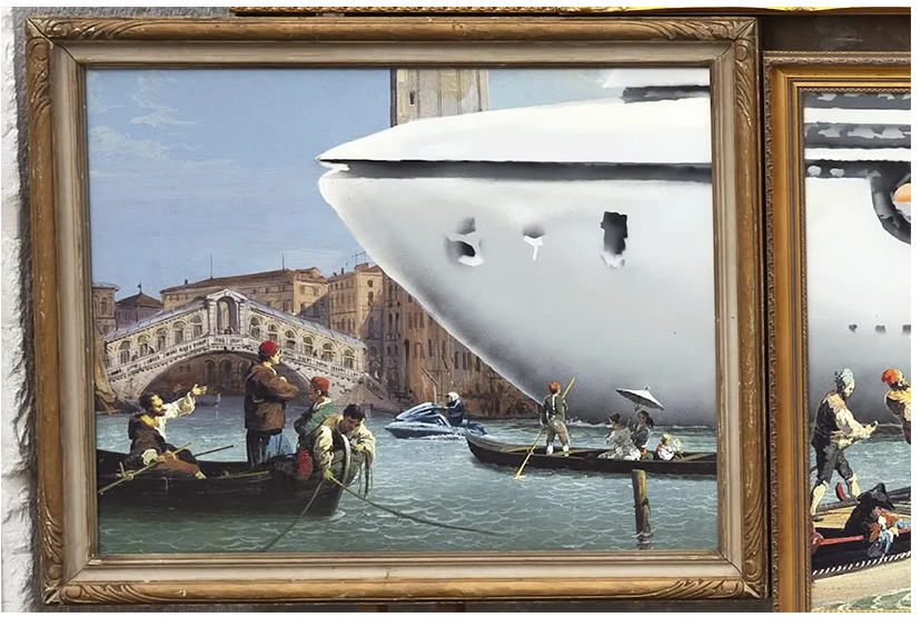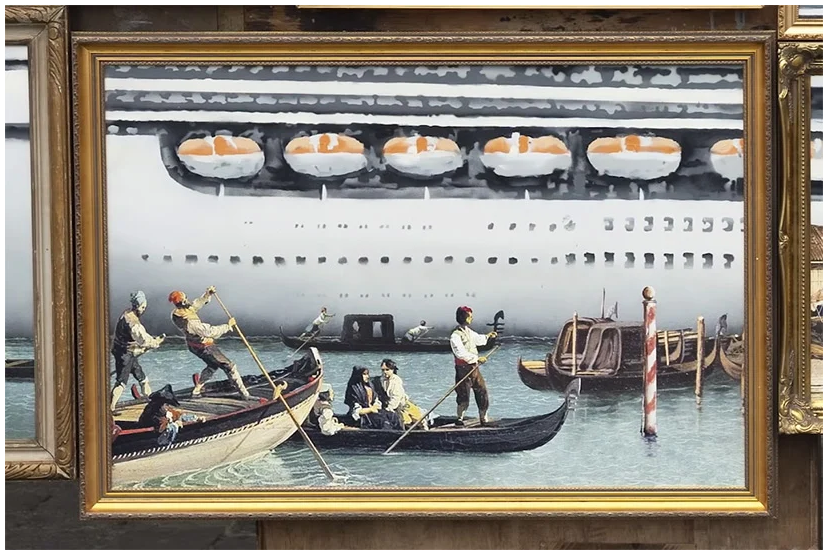 However, upon closer examination, or rather taking a better look at the installation as a whole, this peculiar group of paintings, when assembled, portrays some horrific vision of a giant cruise ship moving through the Grand Canal and obviously marring the historical and romantic landscape of Venice.