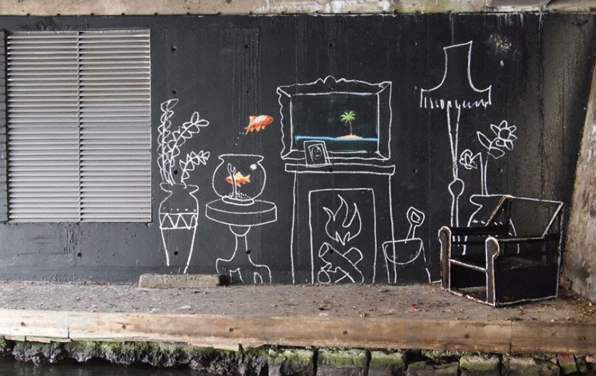 2009 – Banksy paints a bloke ‘wallpapering’ up the graffiti