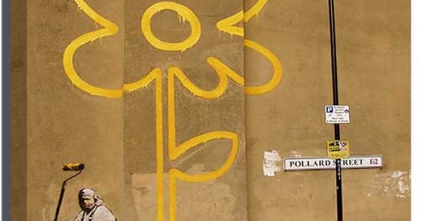 Over the years, Banksy‘s Yellow Lines Flower Painter has been heavily damaged, stenciled and tagged over, with painter being barely visible today due to smashed perspex and part of the wall removed. But the Flower still stands tall.